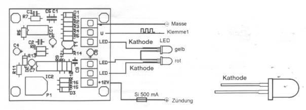 Geschichte. Wie bei allen im Leben zieht das ein das andere hinterher, so ist das auch bei der DIVA. Durch denn von mir vorgesehen Umbau auf das 750ccm³ - 6 Gang Getriebe und den damit anstehenden Einsatz des aus dem gleichen Modell verwendeten Steuergerät bis ich zum Entschluss gekommen einen Einfachen Schaltblitz zu montieren. Da ich die durch die andere CDI möglichen höheren Drehzahlen nicht wirklich benötige, wollte ich eine optische Anzeige die beim Erreichen der originalen Enddrehzahl warnt um den Motor in eigentlichen Drehzahlbereich zu betreiben. Das schont den Motor und hält alle Optionen offen. Na lange Suchen braucht ich ja nicht, hatte ich doch die Schaltung und das Gehäuse einige Zeit im Schrank liegen, den diesen Schaltblitz wollte ich ja schon in meine Gixxe einbauen, aber wie immer hat es mal wieder an der Zeit gefehlt. Bei der von mir verwendeten Schaltung handelt es sich um ein Fertig aufgebautes Modul von Conrad-Elektronik das durch seinen Einfachen Aufbau und den geringen Preis gefällt. Die Notwendige Spannungsversorgung ist bereits im Modul intrigiert. Auch hat man die Option offen eine Vorwarm LED zu betreiben die schon vor den eigentlichen Erreichen der Schaltdrehzahl ein Lämpchen leuchten lässt. |
